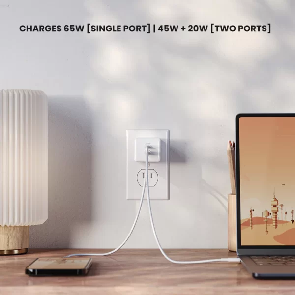 Experience lightning-fast charging with our 65W Dual USB-C Wall Charger, BLITZ 65! This small yet powerful charger features two USB-C ports, allowing you to fast charge two devices simultaneously, whether it’s your laptop, tablet, smartphone, or other compatible gadgets.